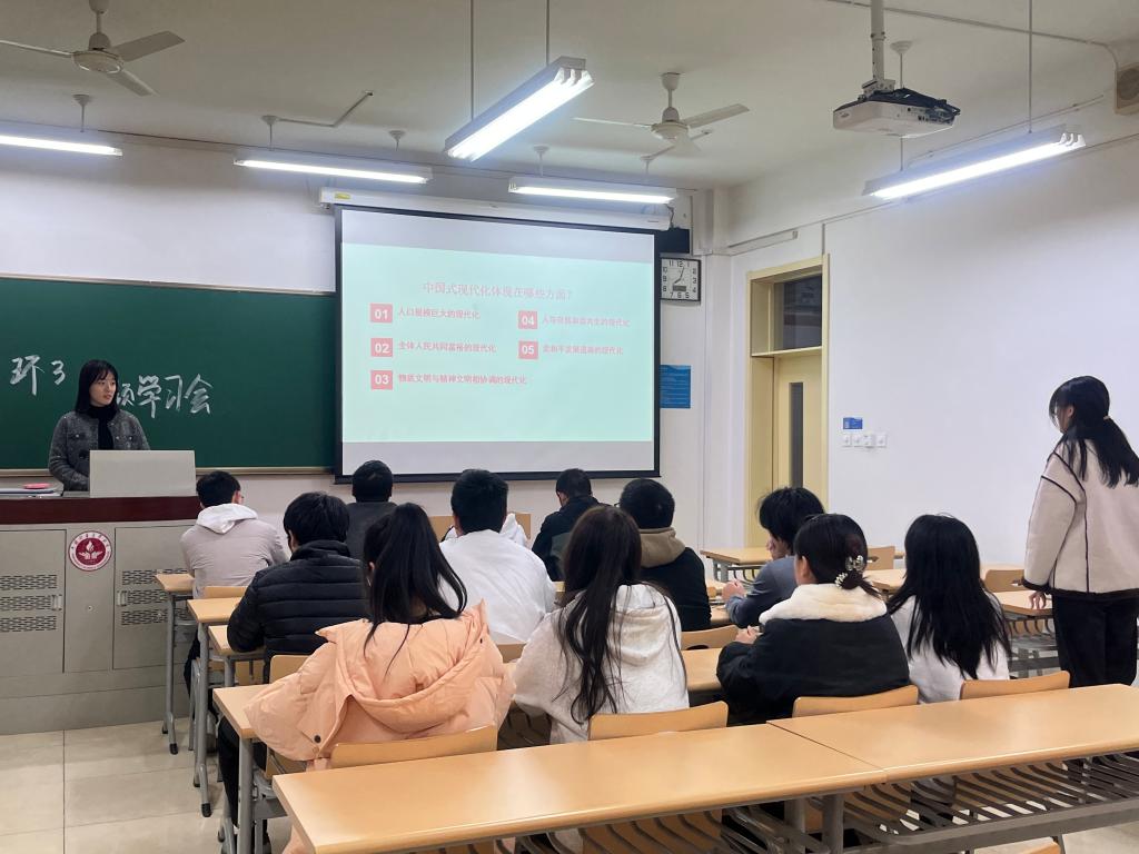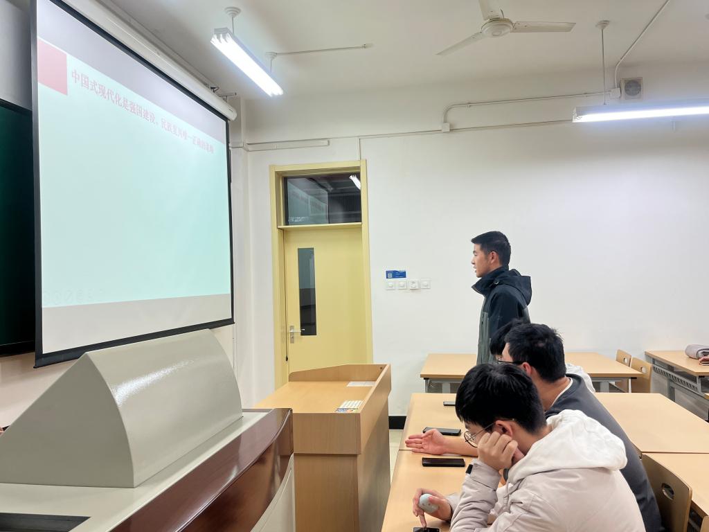 在团支书李傲然与团支部委员会成员纪斯怡、卢成共同学习商讨后,确定了本次专题学习活动共分为“引言、中国式现代化、强国复兴的目标与路径、二十大之强国复兴与中国式现代化”四个板块,采取现场互动+研讨学习+视频观看的形式进行。