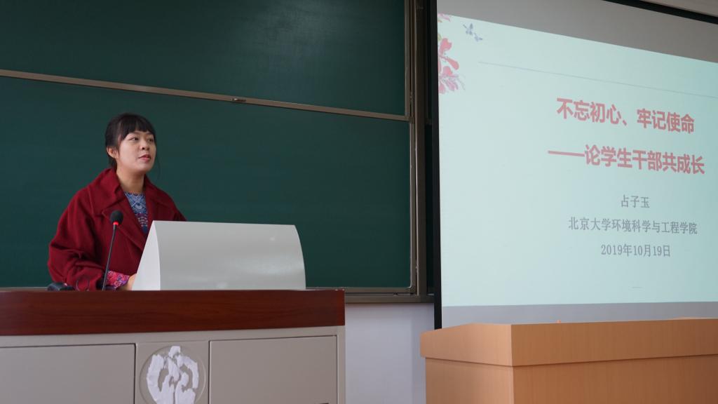 占子玉凭借着在指导培养学生干部方面的丰富经验,从“不忘初心、牢记使命”两个维度出发,为学院主要学生干部上了别开生面的一课。她以社会热点、舆论焦点为切入点,着重论述“予”与“取”的关系,强调学生干部自我认知的重要性,在提升获得感的同时激发个人成就感,最终成就更好的自己。她结合大量工作案例指出,当好党的后备军和助手是当好学生干部的一条主线,要紧密围绕“立德树人,思想引领”根本使命,以建立长效共建机制为抓手,推动党团班协同发展,促进与时代使命深度融合。随后,占子玉以北大十佳党支书优秀事迹,勉励我院学生干部不忘初心,牢牢树立责任意识、目标意识、协作意识,以提高学生干部政治站位、责任担当、业务素质。最后,她结合自身感悟对本次讲座培训做出总结,希望全体学生干部以本次讲座培训为契机,不断在学会担当、懂得感恩、坚守诚信、投身锻炼四个层面作出努力,最终打造一支求真、务实、高效、奋进的高质量学生干部队伍。