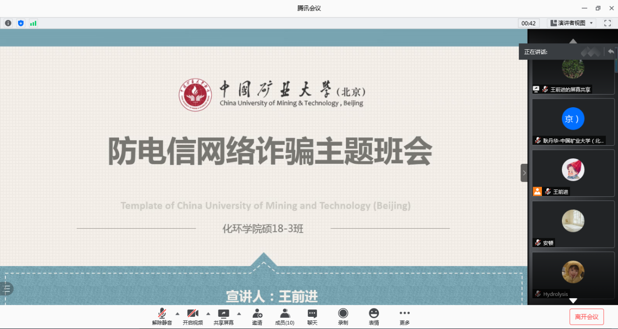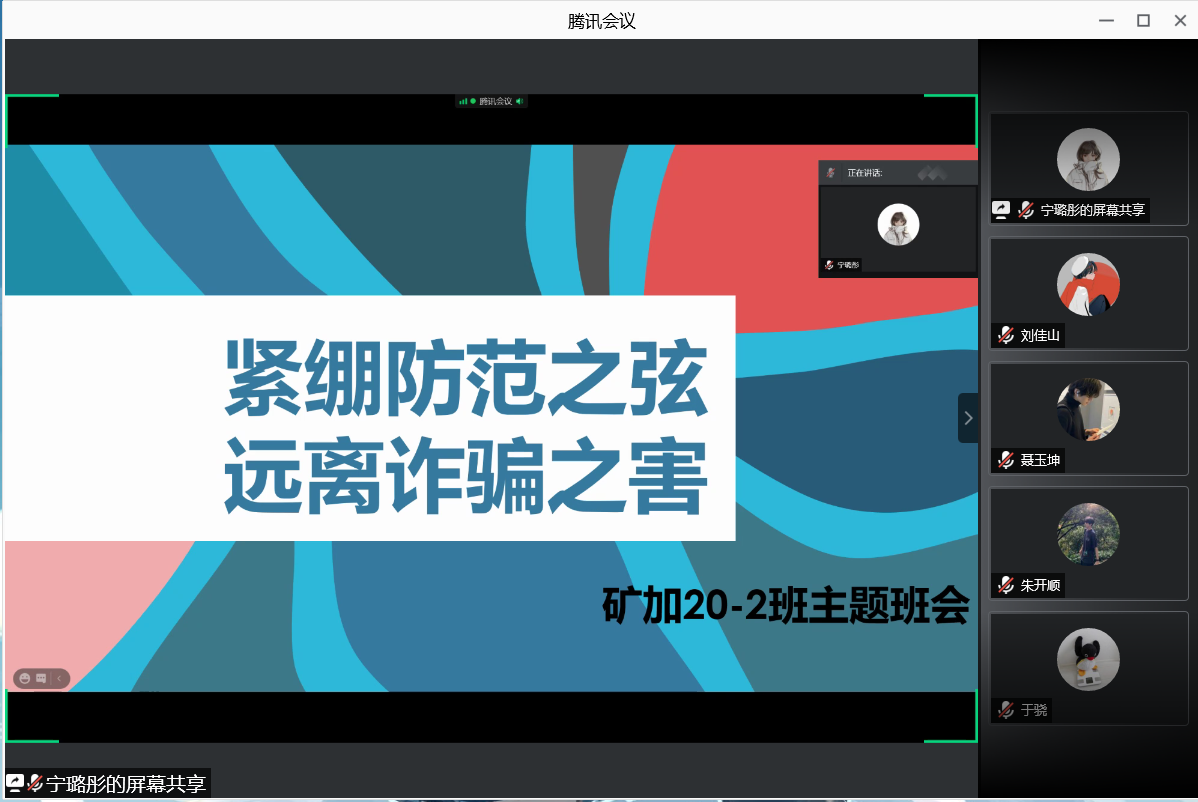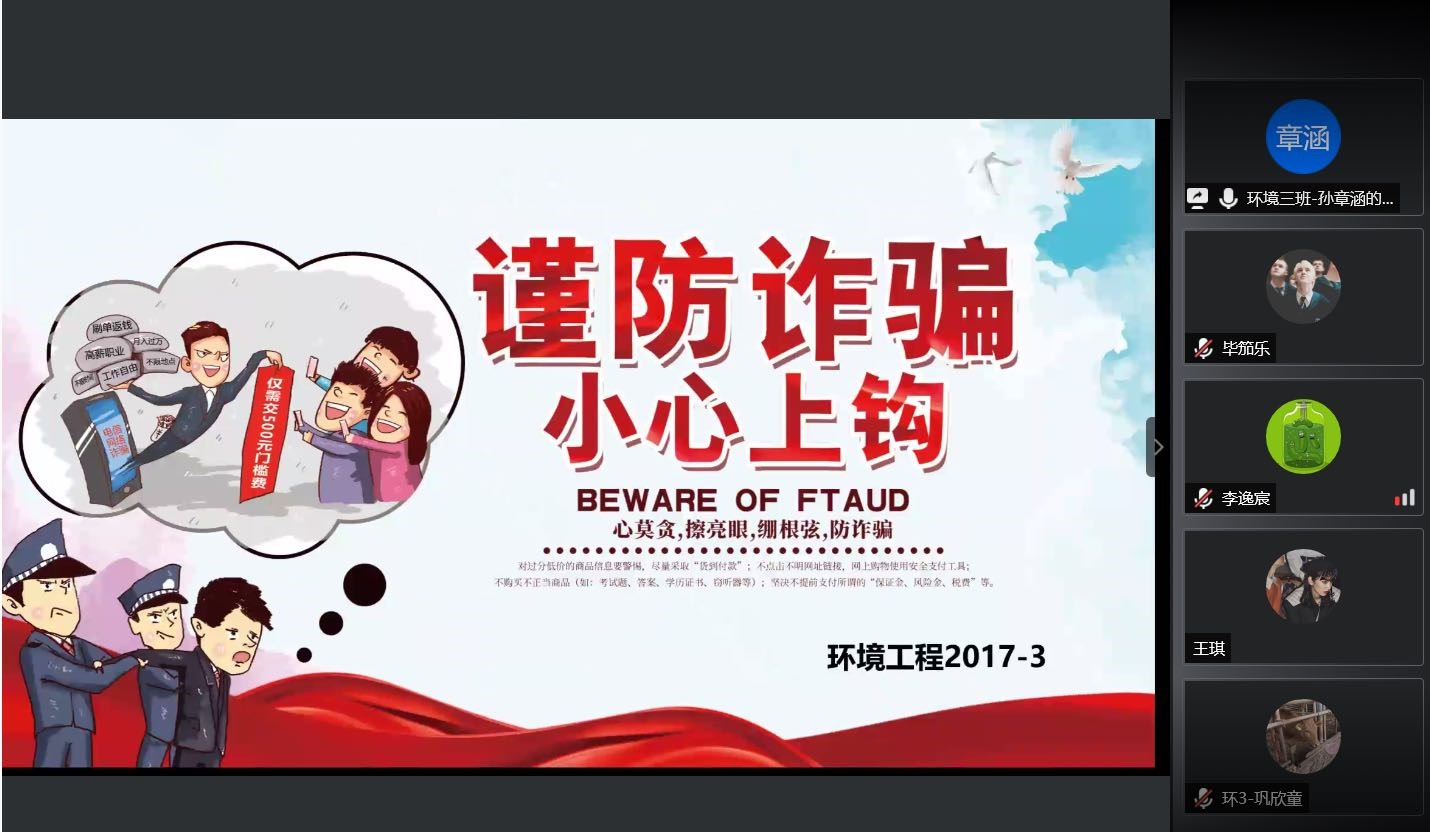 各班通过线上班会的形式,以“防网络电信诈骗”主题宣讲、观看防诈骗视频等方式,对常见的电信网络诈骗的形式进行了详细介绍,并结合诸多现实案例,强调了如何防范电信网络诈骗,提醒同学们在QQ、微信、网络转账、个人信息、密码保护等方面做好安全防护,学会对不明信息真伪的辨别,莫占小便宜,不起贪念,防范于未然。