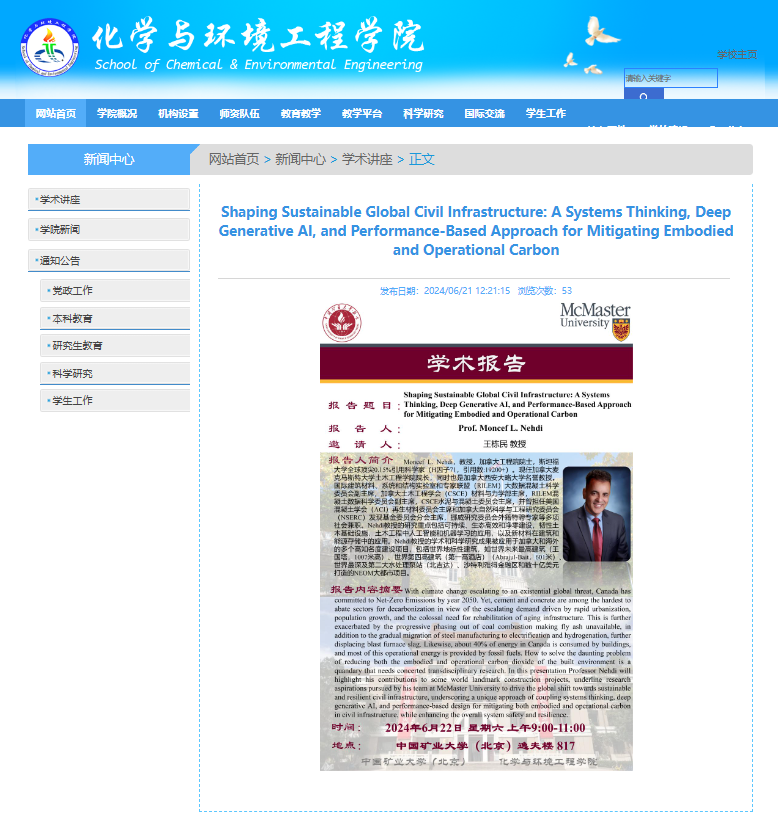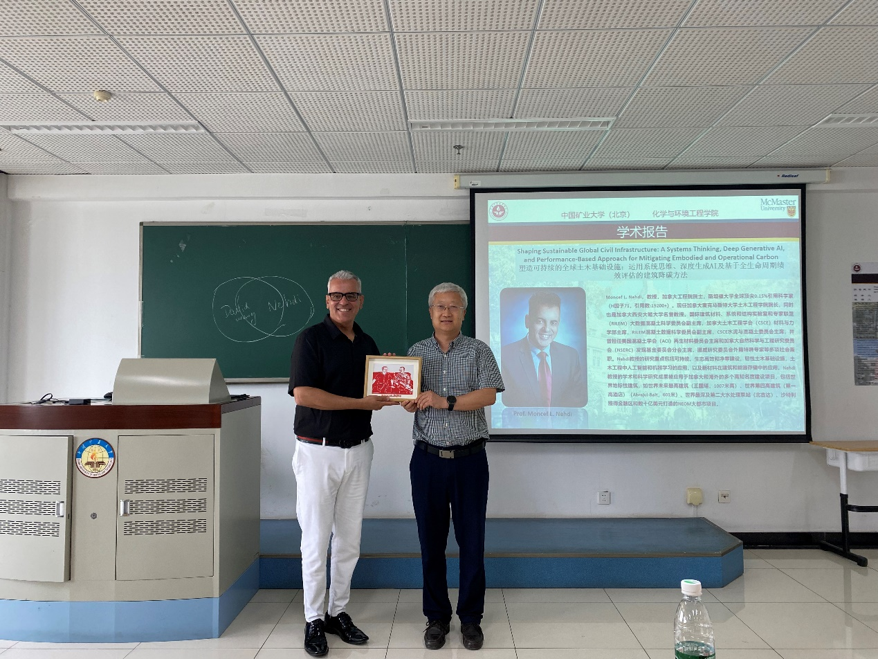 2024622日上午,加拿大麦克马斯特大学Moncef L. Nehdi教授受中国矿业大学(北京)化学与环境工程学院王栋民教授的邀请到访中国矿业大学(北京),并在逸夫楼817Shaping Sustainable Global Civil Infrastructure: A Systems Thinking, Deep Generative AI, and Performance-Based Approach for Mitigating Embodied and Operational Carbon(塑造可持续的全球土木基础设施:运用系统思维、深度生成AI及基于全生命周期绩效评估的建筑降碳方法报告,王栋民教授主持报告会。
