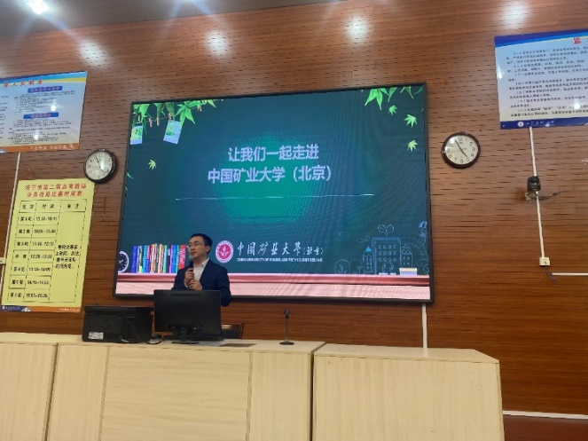 活动现场向嘉祥一中的师生发放了招生宣传资料,播放了中国矿业大学(北京)宣传片。邓久帅从中国矿业大学(北京)的办学历史、科研水平、师资队伍、培养模式、国际合作、培养成效、招生政策等方面作了具体介绍,对母校嘉祥一中近年来为中国矿业大学(北京)输送大批优秀学子表示感谢。期待双方能够以优质生源基地建设为契机,深化交流合作,实现优质教育资源的共建共享,输送更多学子进入中国矿业大学(北京)学习深造,为党育人、为国育才。