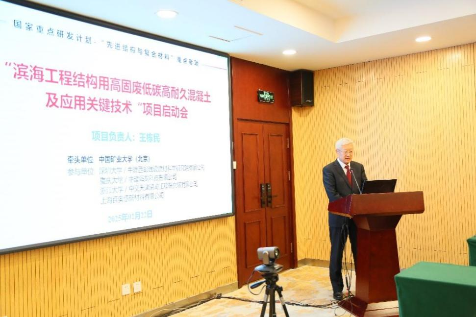 2月22日,由中国矿业大学(北京)牵头,深圳大学、中建西部建设建材科学研究院有限公司、重庆大学、中建海龙科技有限公司、上海百奥恒新材料有限公司、浙江大学、中交天津港湾工程研究院有限公司共同参与,中国矿业大学(北京)化学与环境工程学院化学工程系王栋民教授作为项目负责人的“十四五”国家重点研发计划“滨海工程结构用高固废低碳高耐久混凝土及应用关键技术”项目在北京西郊宾馆召开了项目启动会暨实施方案论证会。会议采用现场会议与视频会议相结合的方式举行。