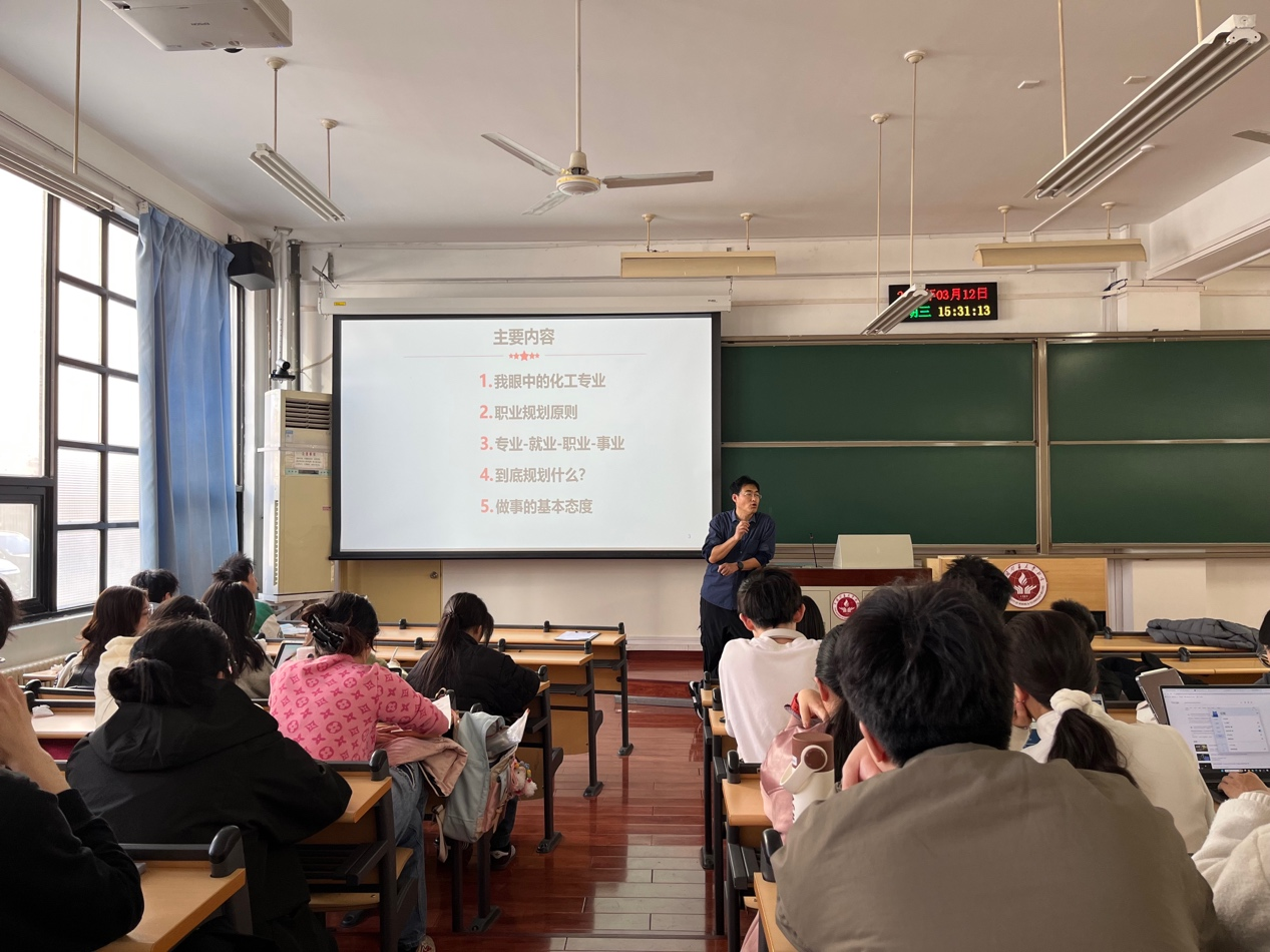 为进一步聚焦《大学生就业指导》课程目标,贯彻落实“校企协同”育人模式,提高学生的就业竞争力,促进学生实现更充分更高质量就业。化环学院特邀行业专家走进课堂,剖析当前行业前景,分享就业经验,帮助学生更好思考和把握未来求职方向。3月12日下午,我校科技矿场校外导师中国科学院大学公旭中研究员走进课堂,为化工专业22级本科生带来了一场精彩的就业指导课。