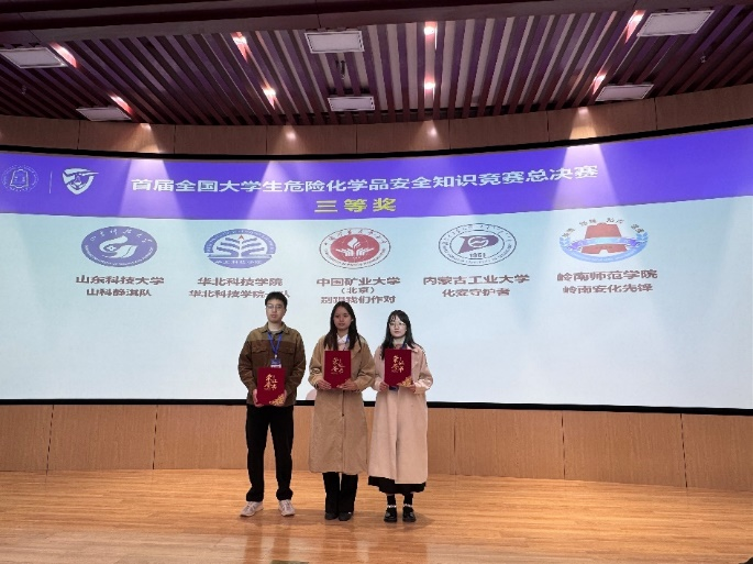 在这场高水平的较量中,化环学子脱颖而出,成绩斐然。“三一队”凭借深厚的知识积累、默契的团队协作,一举斩获团体一等奖。该团队成员于梦然、樊紫艳、董爱婷在杨玉立老师的悉心指导下,在各竞赛环节中发挥出色,将理论与实践完美结合,成为赛场上的耀眼之星。“别跟我们作对队”同样表现不俗,队员陈思远、柳乔、邵毅在宋艺凡老师的指导下,稳定发挥,荣获团体三等奖。此外,董爱婷同学凭借个人在竞赛中的优异表现,荣获个人安全之星奖,为学校再添荣誉。