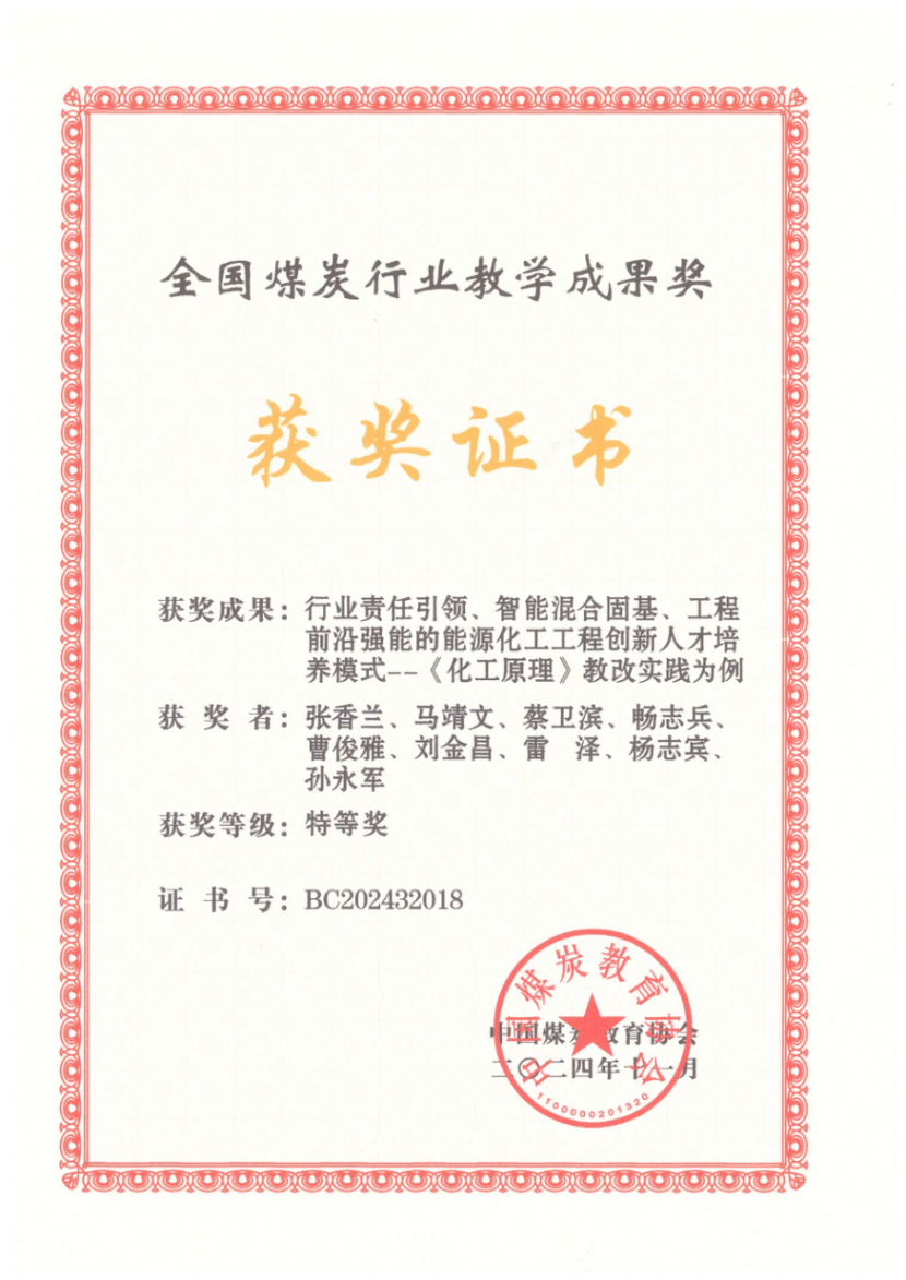 成果名称:行业责任引领,智能混合固基、工程前沿强能的能源化工工程创新人才培养模式            —《化工原理》教改实践为例