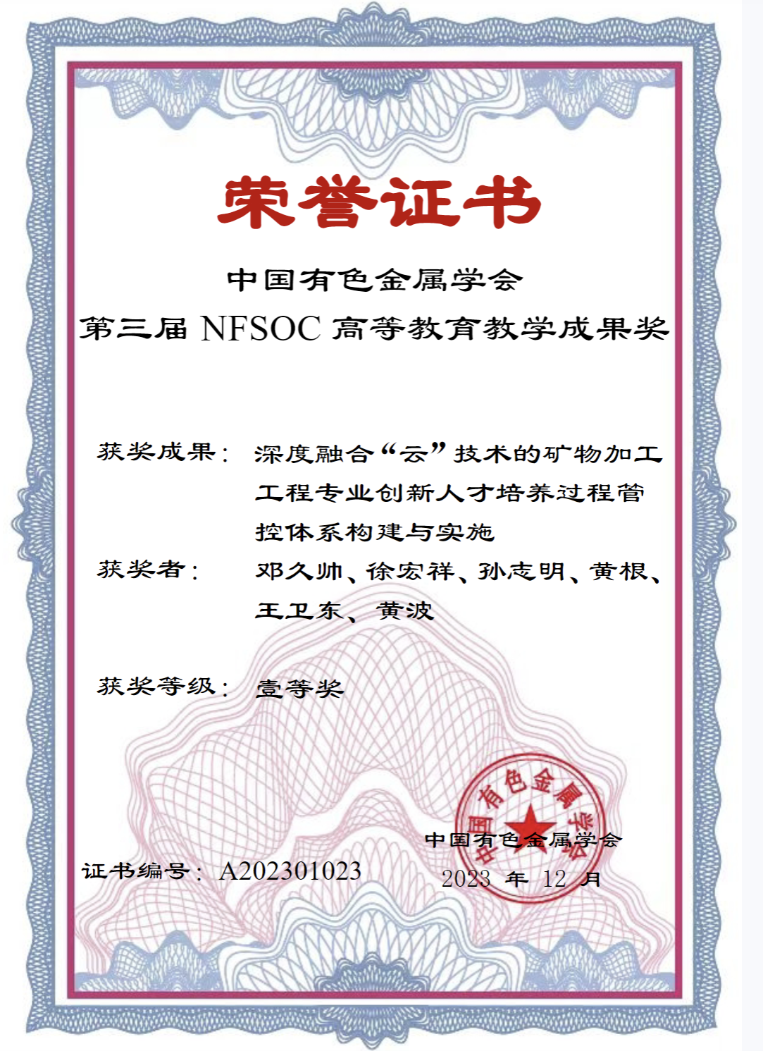 成果名称:深度融合“云”技术的矿物加工工程专业创新人才培养过程管控体系构建与实施